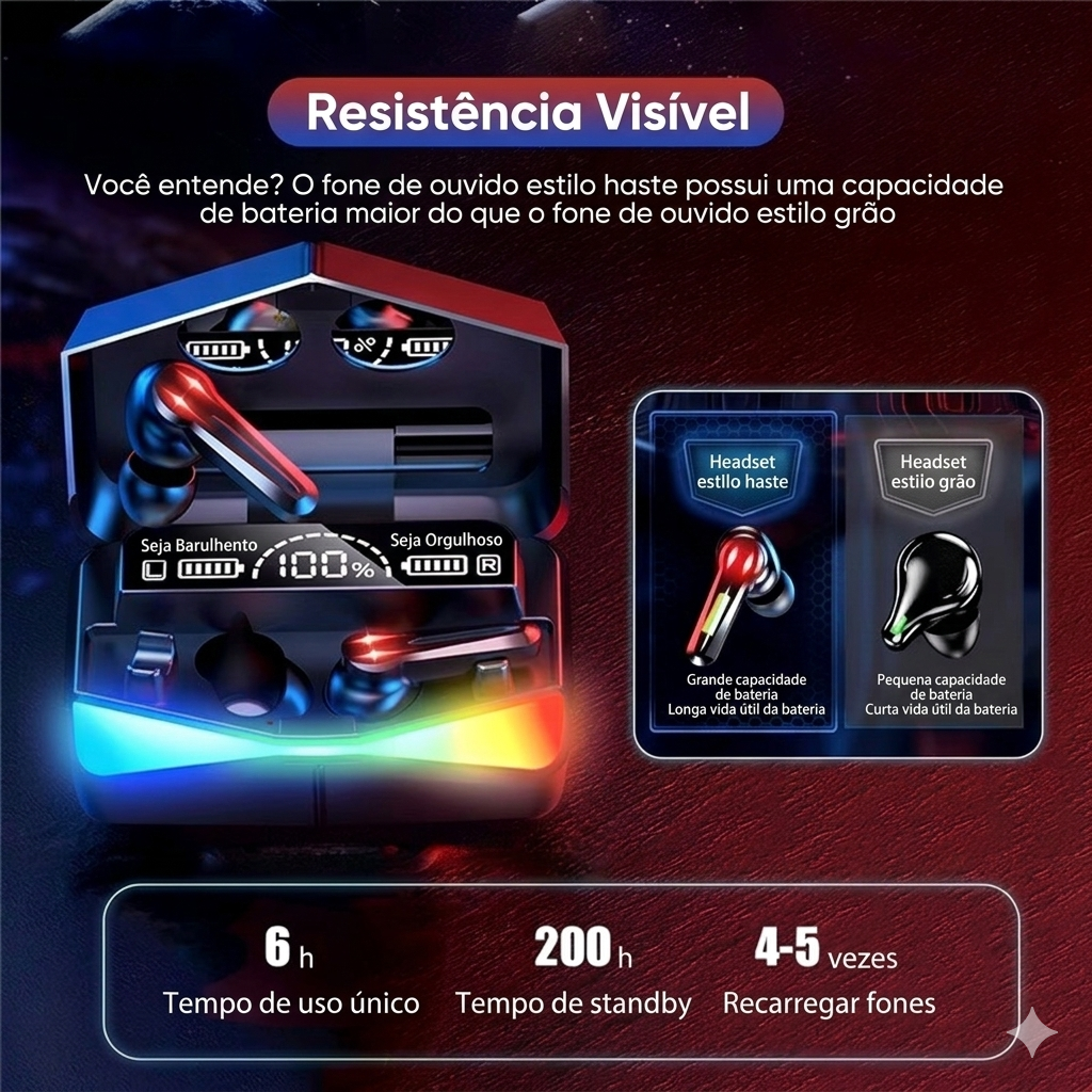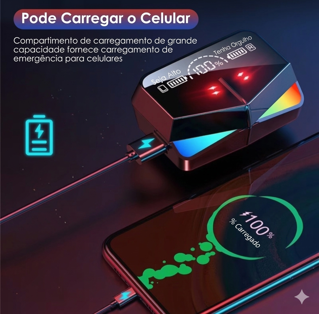 Fone de ouvido sem fio com Bluetooth 5.3, compatível com smartphones e outros dispositivos com Bluetooth. Possui controle por toque para trocar músicas, pausar, atender chamadas e ativar o assistente de voz. Conta com estojo de carregamento com display LED, que mostra a bateria dos fones e do estojo em tempo real.